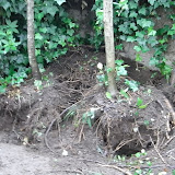 向うへ回って根の間の土を取り除く。根の下を掘り進む。